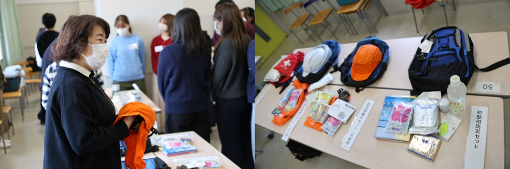 頭を守るためのヘルメットや、持ち出し袋に入れるとよい防災グッズ(女性用、大人用、子ども用)の説明を聞き、日頃の備えの大切さを実感していました。