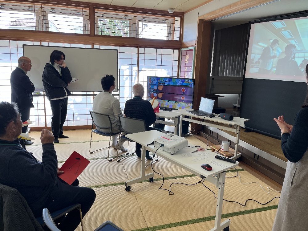「音楽に合わせて太鼓のバチを叩くリズムゲーム」:eスポーツを、狭山市老人福祉センター 宝荘・不老荘の2か所において、大型スクリーンを介して行いました。