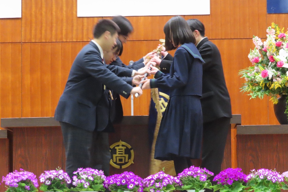 両校生徒会による校旗引継ぎの様子(皆野高校提供)